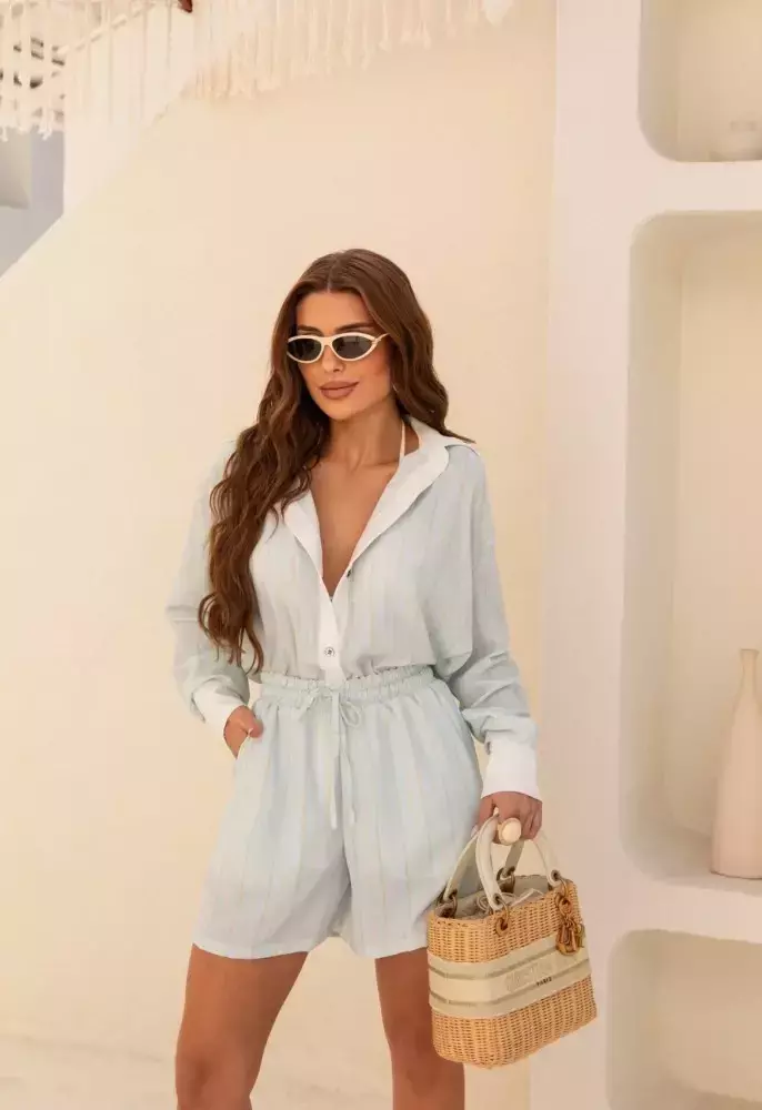 O Conjunto Portofino é confeccionado em crepe Venice com listras finas, perfeito para compor looks sofisticados e frescos. A camisa oversized de mangas longas traz um toque de alfaiataria com punhos ajustáveis por botões, gola com lapela e vista em tom contrastante, pala posterior e barra com recorte assimétrico. Os ombros estendidos e o shape solto garantem conforto e elegância, enquanto o fechamento frontal por botões oferece praticidade.