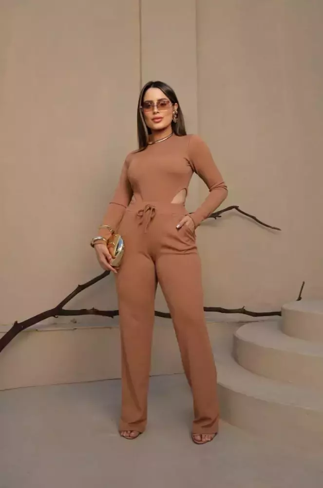 O top de manga longa com gola alta e recortes laterais estratégicos realça a silhueta de forma sofisticada, enquanto a calça com cintura alta e amarração frontal garante praticidade e estilo.