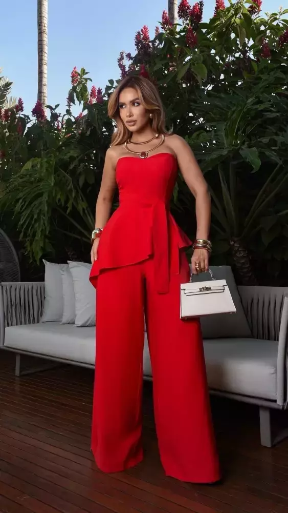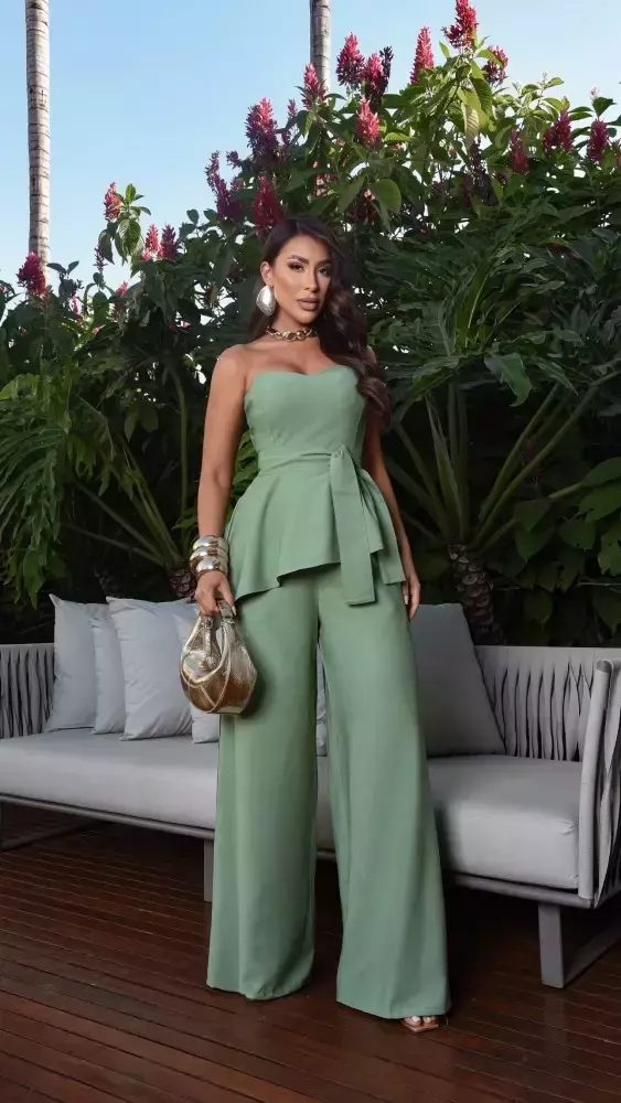O top estruturado com decote tomara que caia e peplum acinturado valoriza a silhueta, enquanto a calça pantalona de cintura alta alonga a figura, garantindo um visual imponente e atual. Um look pronto para quem quer se destacar com classe.