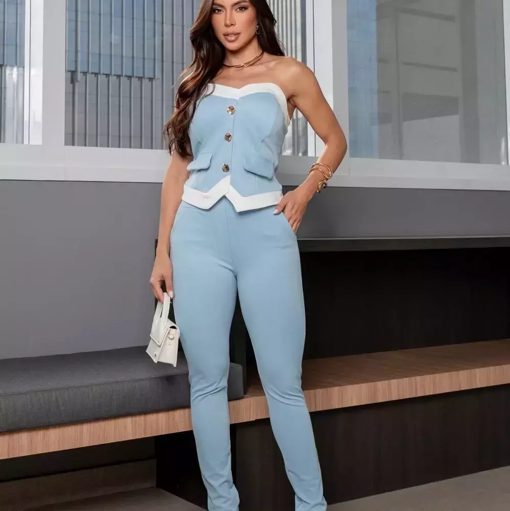 Confeccionado em Ponto Roma, o Conjunto Verona entrega elegância e conforto em uma única peça. Com design tomara que caia estruturado e botões frontais que realçam a silhueta, ele é perfeito para quem busca sofisticação e modernidade no look. A calça de corte reto alonga a silhueta e garante versatilidade, ideal tanto para ocasiões formais quanto para momentos casuais chiques.