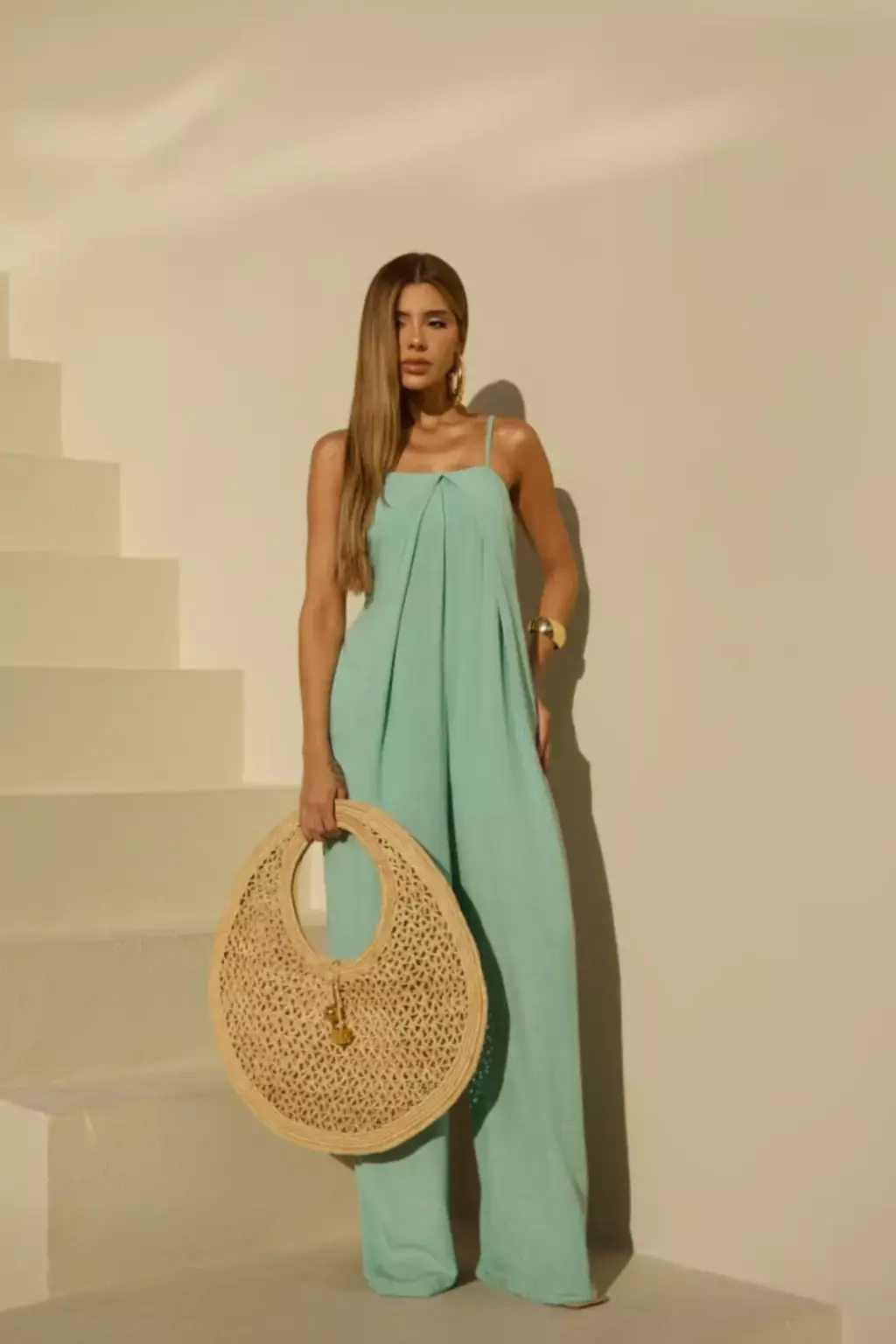 Este look traz uma proposta elegante e minimalista, perfeita para dias ensolarados e ambientes sofisticados. O macacão pantalona em tom verde-claro pastel apresenta um caimento fluido e leve, com pregas frontais que alongam a silhueta e conferem movimento à peça. O decote reto e as alças finas valorizam os ombros e o colo, enquanto os acessórios dourados — como pulseiras largas e colares com detalhe central — acrescentam um toque de glamour ao visual.