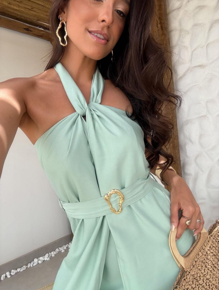 Combine o Macacão Lumini com acessórios dourados para realçar sua elegância natural e finalize com uma bolsa estruturada em palha ou couro para um visual sofisticado e atemporal.