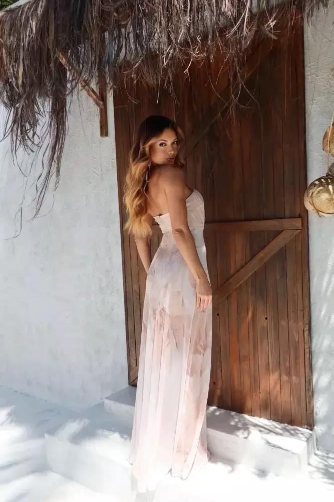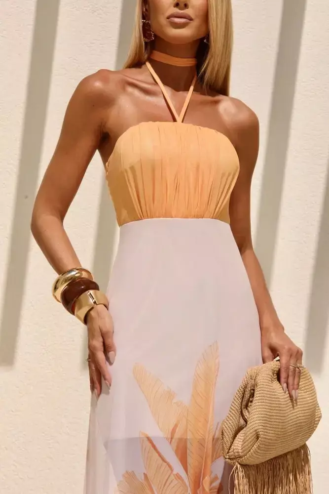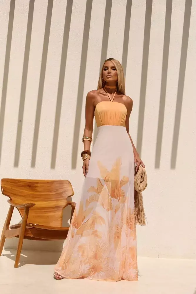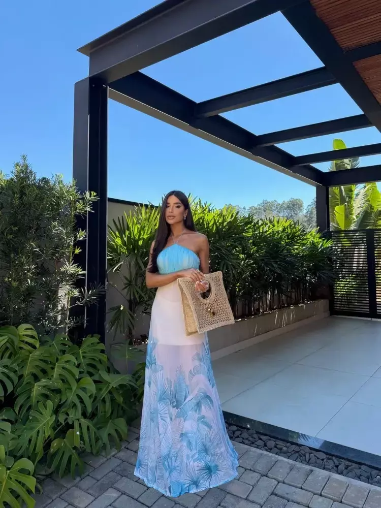 O Vestido Alinda é a peça que une leveza, frescor e sofisticação. Confeccionado em tecido fluido com caimento elegante, ele apresenta busto em tom mais intenso que valoriza a silhueta e saia longa com estampa suave de folhagens, criando movimento e delicadeza. Uma escolha ideal para eventos diurnos, viagens e ocasiões ao ar livre.