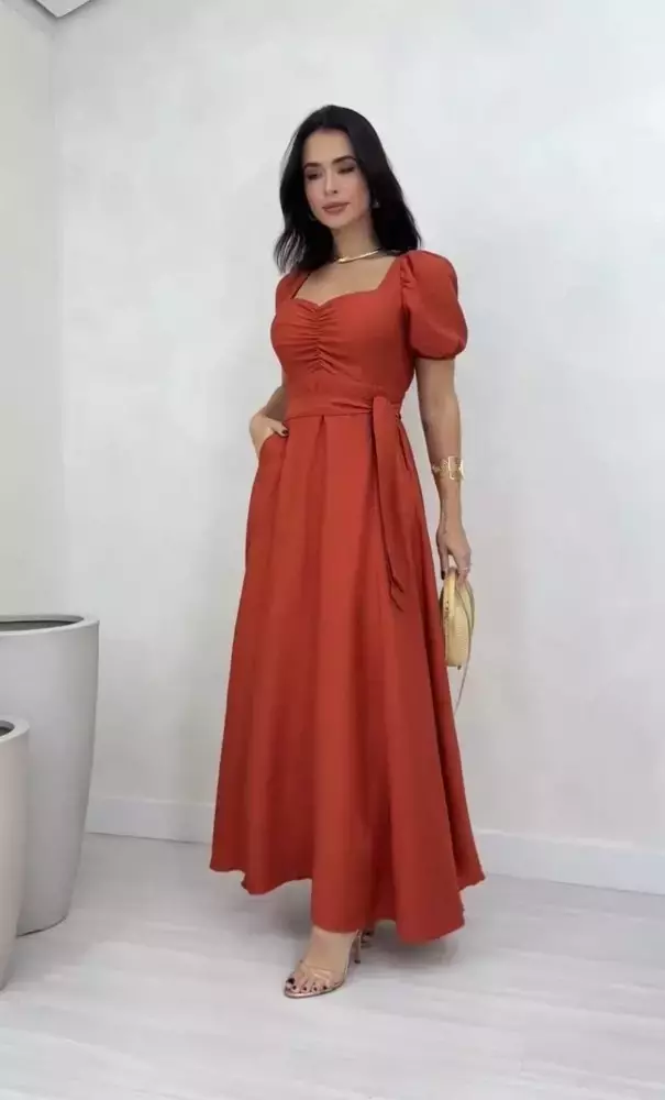 A sofisticação italiana traduzida em cada detalhe. Confeccionado em Viscoamida de toque macio e caimento impecável, o Vestido Florença apresenta modelagem longa e fluida, mangas bufantes delicadas, decote quadrado com franzido sutil no busto e faixa para amarração na cintura, realçando a silhueta feminina com elegância. Disponível em várias cores para combinar com seu estilo em qualquer ocasião.