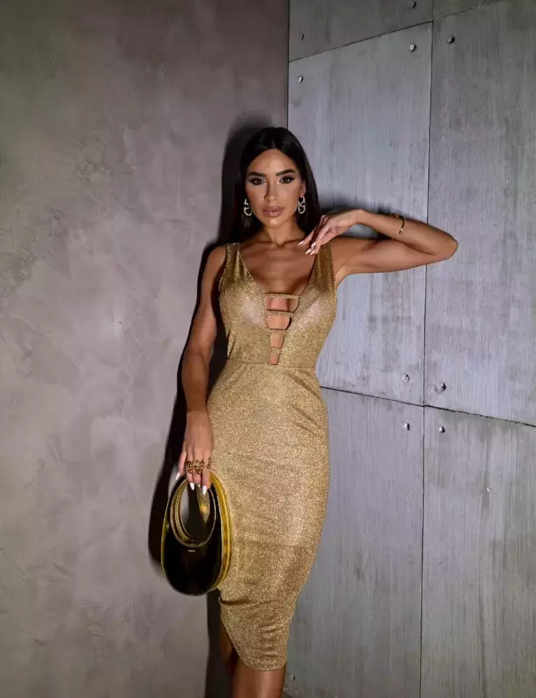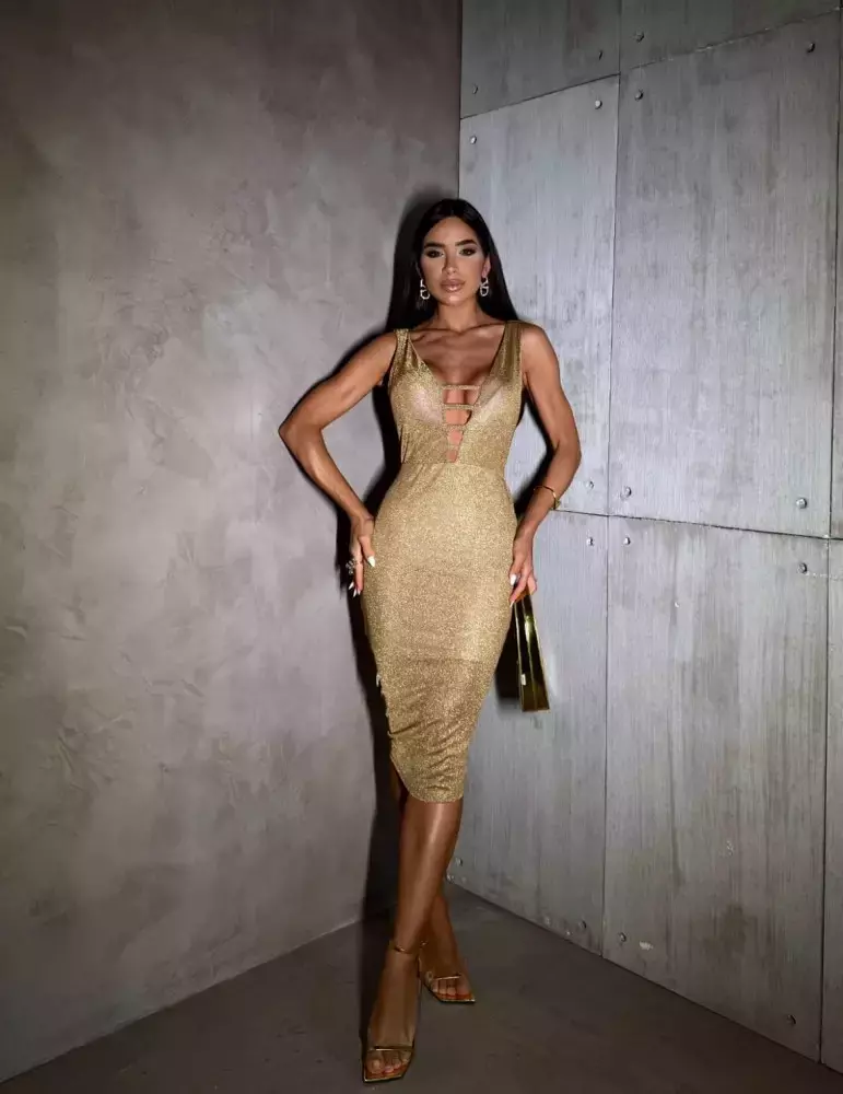 O Vestido Gold Desire é sinônimo de luxo, brilho e poder. Feito em tecido Lurex, ele traz um visual radiante com toque sofisticado e caimento impecável. Seu decote profundo com tiras horizontais valoriza o colo com sensualidade, enquanto a modelagem midi ajustada realça as curvas com elegância. Um look impactante para eventos noturnos, festas, formaturas ou ocasiões especiais.